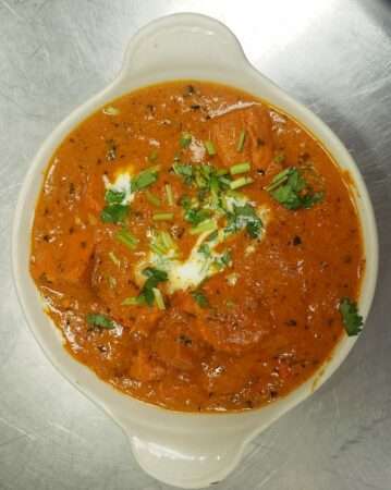 Chunks of fresh homemade cottage cheese, cooked over high heat in a wok with fresh tomatoes, onions and bell pepper blended with special spices.